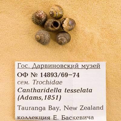 Морской брюхоногий моллюск. Cantharidella tesselata (Adams,1851). Классификация: Моллюски Mollusca, Брюхоногие Gastropoda, Archaeogastropoda, Trochidae