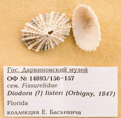 морской брюхоногий моллюск. Diodora listeri (Orbigny, 1847). Классификация: Моллюски Mollusca, Брюхоногие Gastropoda, Archaeogastropoda, Fissurellidae