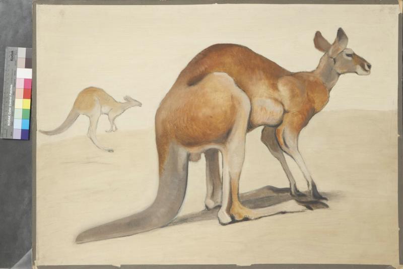 На картине горизонтального формата изображены два рыжих кенгуру, скачущих слева направо. На первом плане в центре композиции сидит кенгуру, опираясь о землю всеми четырьмя лапами и хвостом. Уши поставлены вертикально и повернуты в разные стороны. Окраска животного рыжевато-коричневая, хвост – серый, лапы и брюхо светлые. На втором плане слева прыгает обобщенно написанный другой кенгуру, его вытянутые задние лапы не касаются земли. Животные изображены на локальном светлом желтовато-белом фоне, при этом горизонтальная плоскость чуть темнее. Краски наложены тонкими прозрачными слоями, в тенях просвечивает уголь.