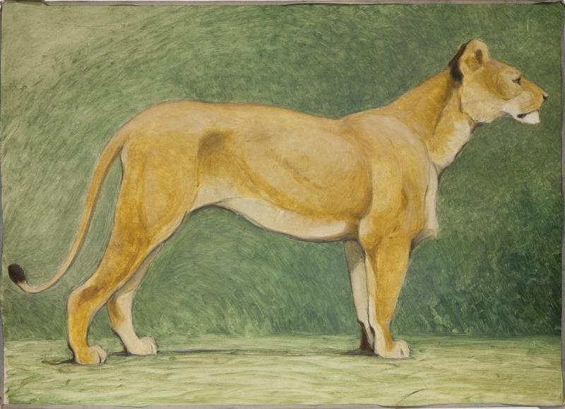 На картине горизонтального формата на зеленовато-сером фоне изображена стоящая боком к зрителю желто-охристая львица. Голова ее нарисована в профиль, она стоит, поставив рядом передние лапы и чуть отставив назад правую заднюю лапу. Хвост опущен, однако его кончик с темной кисточкой слегка приподнят вверх. Краски наложены тонкими прозрачными слоями, фактура мазка хорошо видна.