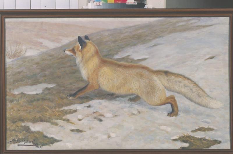 Картина горизонтального формата, основная колористическая гамма теплая. В центре композиции изображена в профиль идущая справа налево вдоль картинной плоскости степная лиса. Она светло-рыжая, охристо-желтого цвета. Лапки темные, уши черные. Лиса замерла на границе между проталиной и тающим сугробом, выставив вперед левую переднюю лапку. Снег розовато-голубоватый, земля на проталинах покрыта желто-серой прошлогодней травой. Вдали слева, за склоном холма, по которому идет лиса, открывается вид на тянущуюся до горизонта розовую степь, где местами еще лежит снег. Линия горизонта расположена высоко, небо над ней белое. Краски наложены тонкими лессировочными слоями.