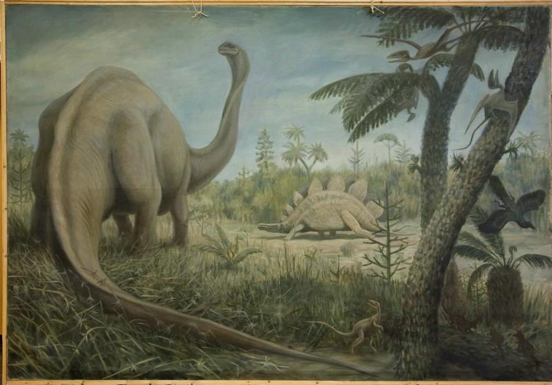 На картине горизонтального формата изображен пейзаж юрского периода с характерными животными. Вся работа решена в зеленовато-серых тонах. На переднем плане в невысокой траве, состоящей из хвощей, бежит мелкий хищный двуногий динозавр – компсогнат(?). Раскрыв пасть, он испуганно оглядывается на громадного ящера – брахиозавра. Хвост гигантского динозавра лежит в траве на переднем плане, в то время как громадное тело занимает средний план картины. Зеленовато-серая кожа динозавра покрыта складками, на спине рельефно выступает валик позвоночника. Длинная змееобразная шея заканчивается маленькой головкой, оглядывающейся назад. Громаду брахиозавра, занимающую левую часть картины, уравновешивают два древовидных папоротника, изображенные в правой части. Рядом с ними находятся некие растения: саговниковое (справа), а также хвойное (слева). По правому стволу древовидного папоротника, покрытому чешуйками, вверх карабкается летающий ящер - диморфодон. Еще один ящер летит над кроной соседнего дерева. Третий диморфодон уцепился вниз головой за ветви этого древовидного папоротника. На упавшем стволе дерева, изображенном в правом нижнем углу картины, сидят три создания, напоминающие белок – мелкие примитивные млекопитающие. Они покрыты темно- коричневым мехом. Чуть выше серовато-черный археоптерикс планирует с дерева. На заднем плане картины, на фоне леса, неспешно движется справа налево стегозавр. Он, как и брахиозавр, имеет зеленовато-серую окраску. Линия горизонта проходит посередине картины. Небо – бледно-голубое, без облаков, но словно окутанное легкой дымкой. Краска наложена тонкими, лессировочными слоями, фактура мазков практически не прослеживается.