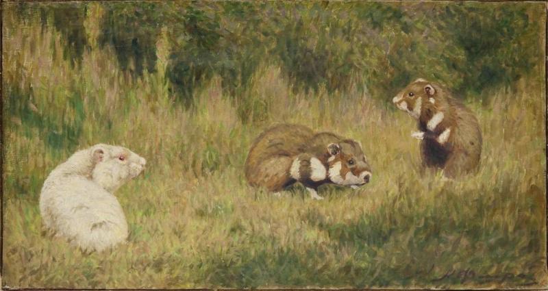 На картине горизонтального формата изображены три хомяка на зеленом лугу. Основная колористическая гамма полотна теплая. На первом плане слева сидит, обернувшись вправо, белый хомяк-альбинос с красными глазами. В центре композиции изображен стоящий на четырех лапках нормально окрашенный светло-коричневый хомяк с белыми пятнами. Справа от него сидит на задних лапках другой хомяк, также нормально окрашенный. Животные изображены на фоне светлой, желтовато-зеленой травы. На первом плане справа лежит тень, трава в ней зеленовато-коричневая. Задний план также погружен в тень, возможно, отбрасываемую какими-то кустами. Краски наложены пастозными раздельными мазками, между которыми местами просвечивает не закрашенный белый грунт.