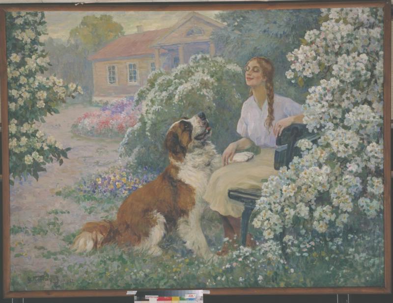 На картине горизонтального формата изображена собака породы сенбернар со слепой девушкой в саду. Основная колористическая гамма полотна холодная. На первом плане справа на темно-синей скамейке сидит девушка. Она одета в светло-фиолетовую блузку и светлую юбку чуть ниже колена. На ногах – коричневые чулки. Длинные русые волосы девушки заплетены в две косички, одна из которых упала ей на грудь. Глаза ее закрыты, лицо улыбается. Слева перед девушкой сидит большой бело-рыжий сенбернар, преданно на нее глядящий. Пасть собаки слегка приоткрыта, левую переднюю лапу она положила на колени девушке. Левая рука девушки лежит на спинке скамейки, а правой она касается лапы собаки. Трава у ног девушки усыпана мелкими белыми, желтыми и розовыми цветами. На первом плане слева и справа изображены яблоневые ветви сплошь в белых цветах. На втором плане написан невысокий куст в белом цвету, у подножия которого находятся заросли анютиных глазок. На третьем плане в центре стоит одноэтажный розоватый деревянный дом с колоннами и треугольным портиком посередине. Перед ним разбита большая клумба розовых и фиолетовых цветов. Краски наложены густо, пастозно, фактура мазка хорошо видна.