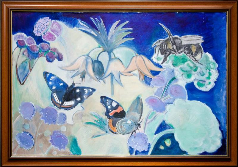 Бабочки и шмели. На ярко-васильковом фоне представлены растения с яркими цветками (лиловые, небесно-голубые, нежно-розовые) в увеличенных размерах. Их изображения условно-декоративные, в основе которого лежит реалистическое начало. На цветках "лакомятся" нектаром два шмеля (вверху справа) и две бабочки внизу слева. Их изображения также декоративно- условные. Картина