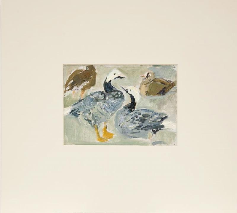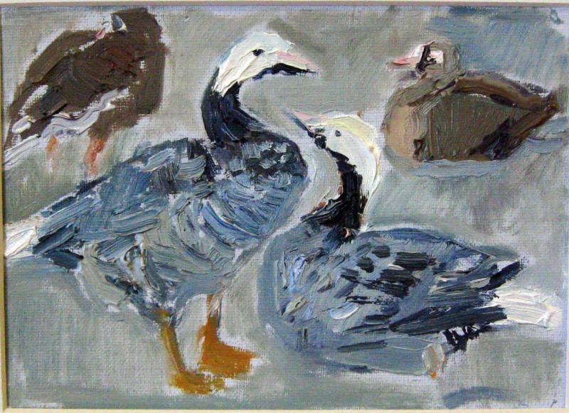 На картине горизонтального формата на первом плане в центре композиции изображены два горных гуся, а на втором плане по краям – две другие водоплавающие птицы. Основная колористическая гамма полотна холодная. Фон, на котором изображены птицы, светлый, голубовато-серый. Окраска горных гусей голубовато-серая с черными крапинками, шея и нижняя часть головы – черная, головы и концы хвостов белые, клювы розовые, лапки светло-оранжевые. Птицы изображены в профиль, «лицом» друг к другу. Гусь, расположенный слева, стоит, а справа – сидит, поджав лапки. На втором плане в левом верхнем углу композиции расположено обобщенное написанное изображение стоящей водоплавающей птицы, которая чистит перья у себя на спине, повернув голову назад. Напротив, в правом углу, вторая такая же птица спокойно сидит на земле, поджав лапки. Окраска обоих птиц светло-коричневая, оливково-зеленоватая, лапки оранжевые, клювы розовые. Краски наложены очень густо, пастозно, фактура мазка хорошо видна. Холст в паспарту.