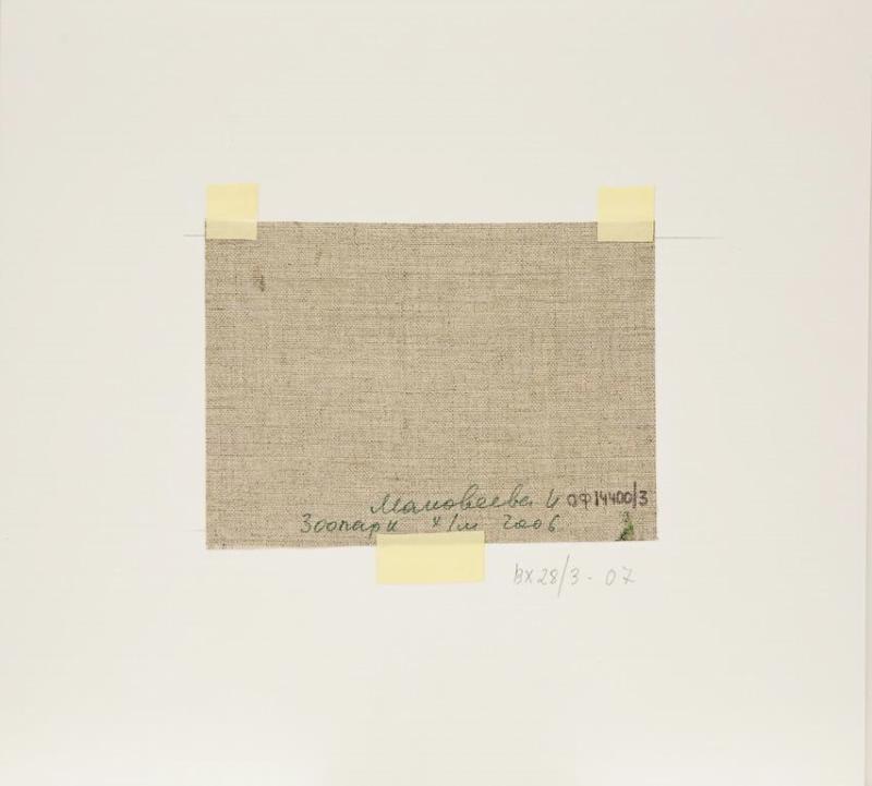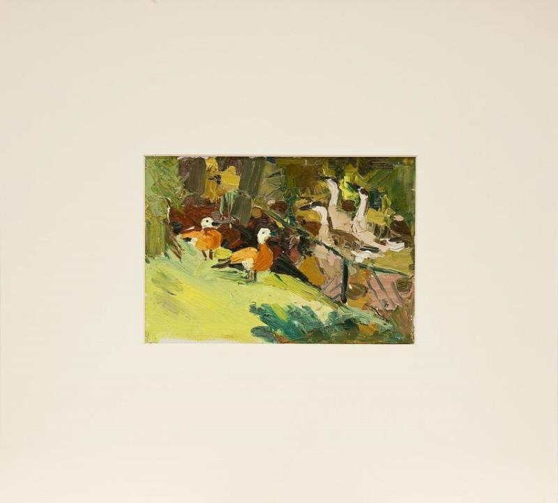 На картине горизонтального формата изображен уголок зоопарка, где по разные стороны от невысокого заборчика, разделяющего разные вольеры, гуляют две красные утки (огари) и три сухоноса, или китайских гуся. Основная колористическая гамма произведения теплая. Слева на желто-зеленой траве возле темно-зеленой оградки гуляют две красные утки. У них оранжево-коричневое оперение, белые головы и белые полосы на крыльях, черные маховые перья, черные клювы. Справа за заборчиком стоят три гуся, вытянув шеи и подняв головы, они смотрят налево, в сторону уток. У гусей верхняя часть головы и задняя сторона шеи темно-коричневые, клювы черные со светлой каймой у основания, шея спереди, грудь и живот кремовые, спины и бока коричневые, маховые перья черные. Задний план написан обобщенно, широкими мазками светло-зеленого, оливкового, светло-охристого, лимонно-желтого и красно-коричневого цвета. Справа вдали вырисовывается силуэт коричневой утки с черной головой. Краски наложены очень густо, пастозно, фактура мазка хорошо видна. Холст в паспарту.