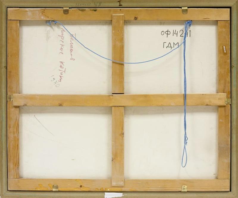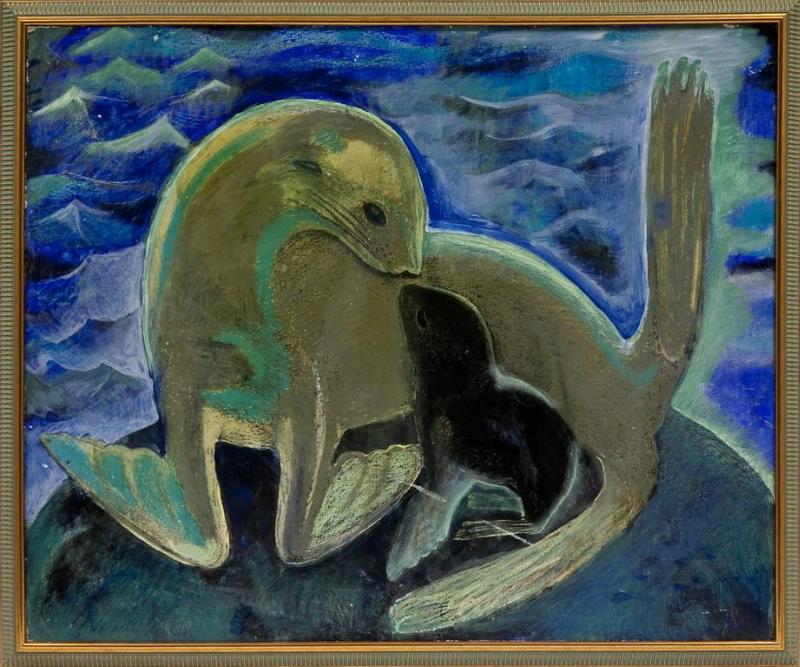 На картине горизонтального формата крупным планом изображен морской котик с детенышем. Основная колористическая гамма холодная. Изображение стилизованное, декоративное. Котики сидят на черном камне у волнующегося синего моря. Взрослый желтовато-зеленый котик своим телом словно бы окружает черного детеныша, а один из его задних ластов поднят вертикально. Животные тянутся друг к другу мордочками и вот-вот соприкоснутся. Слева за взрослым котиком море покрыто заостренными треугольными волнами, а справа волны переданы плавными линиями. Краски наложены плотно, густо, слои словно «втерты» друг в друга.