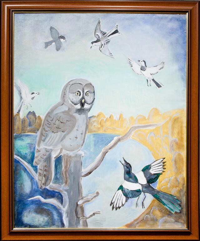 Бородатая неясыть. Композиция решена в пастельных серо-голубых и палевых тонах. Слева на сером пеньке сидит неясыть. Вокруг неё - сороки. Одна из них изображена крупным планом справа в динамичной позе ( подлетает к неясыти). Её окрас вполен реалистичен (иссиня-белый). Четыре остальные "заняли" круговое положение вокруг неясыти и парят в голубом небе. Их изображения почти силуэтные. Картина