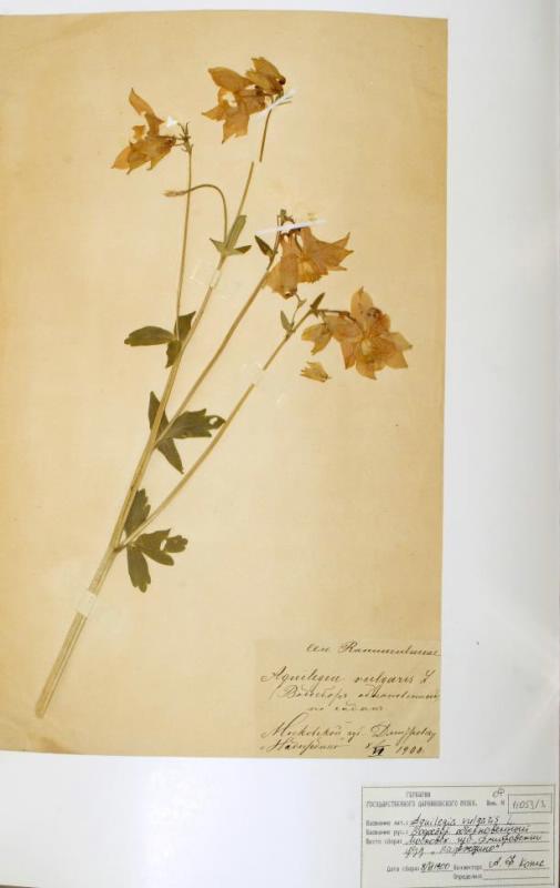 Гербарий. Водосбор обыкновенный. Aquilegia vulgaris L. Классификация: Растения Plantae seu Vegetabilia, Растения, Ranunculaceae, Водосбор обыкновенный Aquilegia vulgaris L.