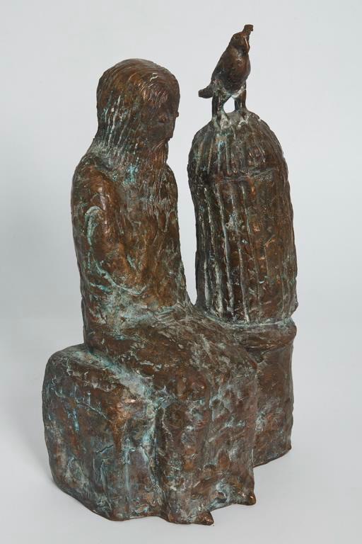 Скульптурное изображение старика с попугаем. Человек сидит на кубической подставке, правая рука прижата к груди, левая опущена на низ живота. У старика длинные волосы, расчесанные на прямой пробор, длинная борода и усы. Слева от старика на цилиндрическом основании стоит высокая круглая клетка, на верху которой сидит птица с хохолком (попугай). Прутья клетки показаны рельефом.