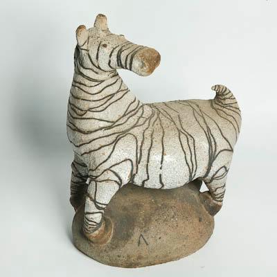 Скульптурное стилизованное изображение зебры на подножии в виде овального в плане камня. Животное стоит, поставив все ноги параллельно. Все четыре широкие копыта упираются в подставку под углами. У зебры очень широкое толстое тело и короткие ножки. Голова с настороженными ушами повенута налево и назад. Короткий хвост поднят вертикально, его острый конец загибается вперед. Глаза зебры переданы маленькими бугорками, ноздри - широкими углублениями. На шее сверху - короткая грива. Зебра светло-серого цвета, тонкие черные полоски переданы при помощи следов от выгоревшей при обжиге медной проволоки. Скульптура составляет с коричневато-серым подножием-подставкой одно целое.