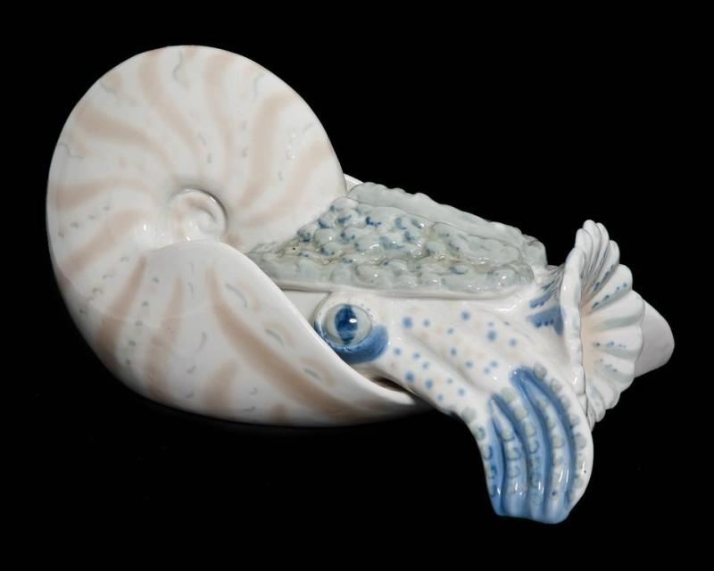 Скульптурное изображение головоногого моллюска наутилуса. Спиральная раковина закручена в одной плоскости симметрии. Окрас раковины тигровый: на белом фоне поперёк расположены светло-коричневые неровные полосы, между которыми идут пункитные полоски из светлых серо-зеленых крапин. Спереди из отверстия раковины выглядывает сам моллюск: сверху он прикрыт бугристым капюшоном серовато-зеленого цвета, напоминающим мозг. Под ним по бокам находятся большие круглые серо-зеленые глаза с вертикальным синим зрачком. Впереди раскрыта воронка, окруженная щупальцами. Она похожа на розетку, светло-коричневую в центре, с зеленовато-серыми полосками и синими крапинками, расходящимися радиально от центра. По бокам от воронки симметрично расположены два пучка щупалец: 5 слева и 5 справа. Они в верхних частях крапчатые, а на концах синие с серо-зелеными кружками.