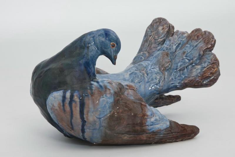 Скульптурное изображение сидящего голубя. Голова повернута налево и назад, клюв направлен вниз. Левое крыло слегка приспущено и касается земли своим концом. Хвост полураспущен веером и поднят вверх. Фактура перьев передана при помощи рельефа. Голубь голубовато-коричневого цвета, шея и грудь спереди темно-синие. Глаза - черные с оранжевым ободком.
