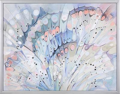 Образное изображение фрагмента крыла голуббянки. Оно выглядит как бы увеличенным, так как рассматривается вооружённым глазом (лупа с большим разрешением, не сильный микроскоп). Тщательно прописаны жилкование. Великолепно сочетаются в гамме цветов нежно-розовый, нежно-голубой и бледно-сиреневый. Точно это крылышко инкрустировано полудрагоценными камнями - розовыми кварцами, бледными аметистами и печально-голубыми сапфиринами. На этом полотне воедино слились и поэзия,и философия и виртуозное мастерство. Мастер мыслит образно: то ли это образ полевого цветка, то ли кружевная изморозь на стекле, то ли - крылышко бабочки голубянки. Название "полевой цветок " - это авторские ассоциации нежного крыла бабочки с нежными лепестками полевого цветка, пробуждающегося утром в каплях росы. Ассоциации представлены в сочетании с фантазиями автора.