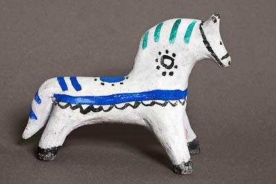 В каргопольской игрушке белый цвет ( "сияющий белизной") сравнивают со светом, излучаемым изнутри. Этот цвет символизирует землю, плодородие и воспринимается как лучезарный, светоносный. Белый конь (как и рыжий) - посланник тепла и солнечного света и всякого блага, он - основа землепашества. С культом солнца в славянской мифологии связывают коня (и уточку): утром огнегривый конь возводит солнце на небосвод (а уточка прячет его на ночь в воду). В росписи этой фигурки коня преобладают цвета "зимнего настроения" (зимой цвет росписи глубокий и торжественный): чёрный, белый, синий (обычно ещё бывает и малиновый, но в данном случае отсутствует). Если разбирать все знаки и полоски, изображённые на фигуре коня, то можно заметить дугообразне полосы, символизирующие зёрна и пашню. Окружности с точками - символы солнца . Сами по себе овалы и точки означают зерно.