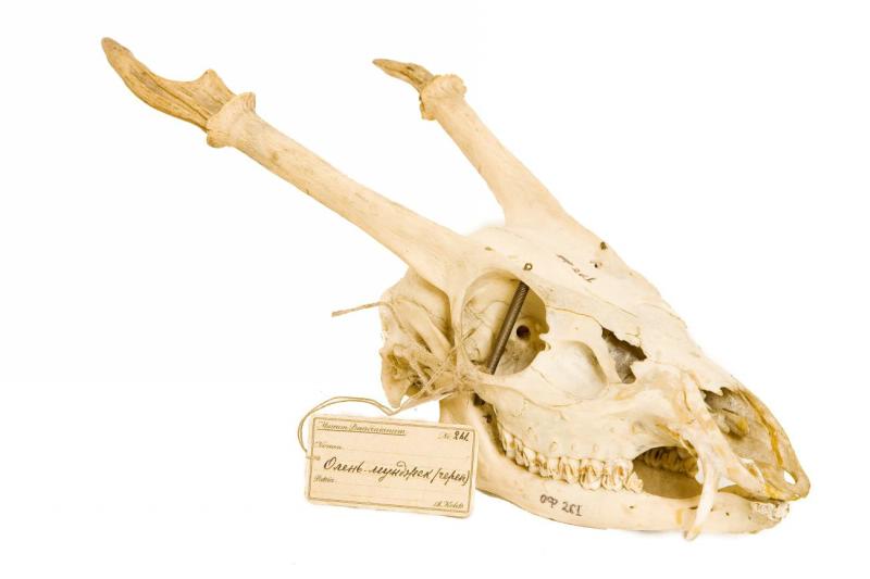 Костный материал. Рога. Череп оленя мунтжака. Muntiacus muntjak (Zimmermann, 1780). Классификация: Хордовые Chordata, Позвоночные Vertebrata, Млекопитающие Mammalia, Парнокопытные Artiodactyla, Оленевые Cervidae, Cervinae, Мунтжак Muntiacus muntjak Zimmermann,1780