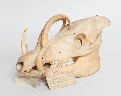 Костный материал. Череп бабируссы. Babyrousa babyrussa (Linnaeus, 1758). Классификация: Хордовые Chordata, Позвоночные Vertebrata, Млекопитающие Mammalia, Парнокопытные Artiodactyla, Свиные Suidae, Бабирусса Babyrousa babyrussa L.,1758