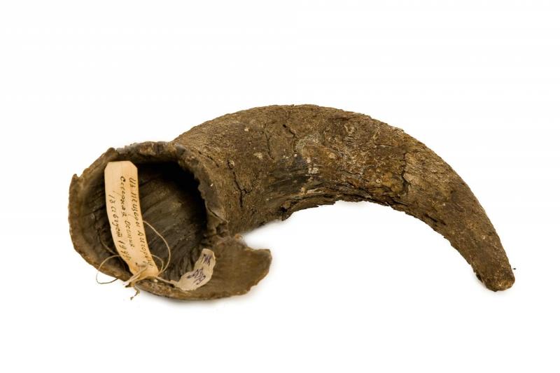 Костный материал. Роговой чехол зубра. Bison bonasus. Классификация: Хордовые Chordata, Позвоночные Vertebrata, Млекопитающие Mammalia, Парнокопытные Artiodactyla, Буйволовые Bovidae, Bovinae, Зубр Bison bonasus L.,1758