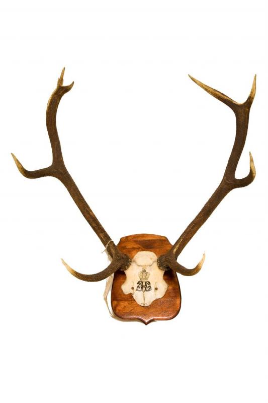 Костный материал. Рога благородного оленя на лобных костях. Cervus elaphus. Классификация: Хордовые Chordata, Позвоночные Vertebrata, Млекопитающие Mammalia, Парнокопытные Artiodactyla, Оленевые Cervidae, Cervinae, Благородный олень Cervus elaphus L.,1758