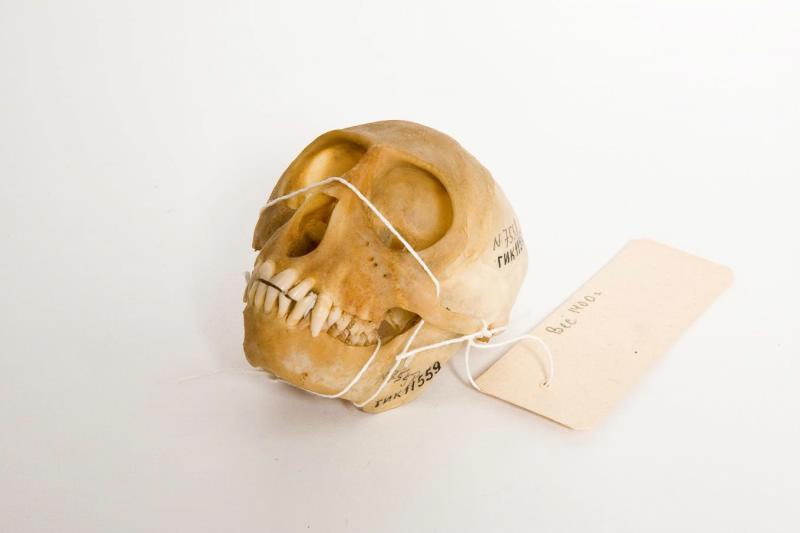 Костный материал. Череп гриветы (зелёной мартышки). Cercopithecus aethiops. Классификация: Хордовые Chordata, Позвоночные Vertebrata, Млекопитающие Mammalia, Приматы Primates, Мартышковые Cercopithecidae, Cercopithecinae, Гривет Chlorocebus aethiops aethiops (Linnaeus, 1758)