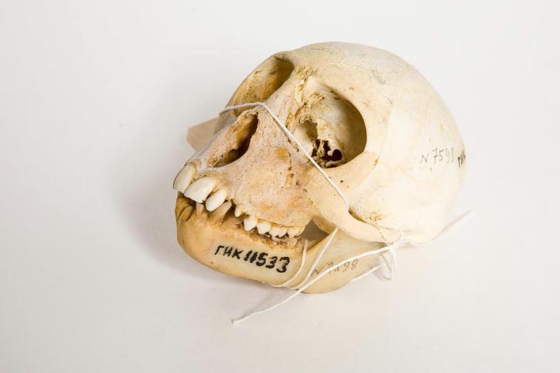 Костный материал. Череп гриветы (зелёной мартышки). Cercopithecus aethiops. Классификация: Хордовые Chordata, Позвоночные Vertebrata, Млекопитающие Mammalia, Приматы Primates, Мартышковые Cercopithecidae, Cercopithecinae, Гривет Chlorocebus aethiops aethiops (Linnaeus, 1758)
