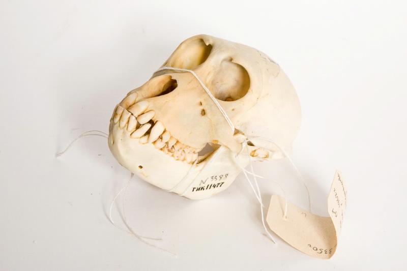 Костный материал. Череп макака резуса. Macaca mulatta. Классификация: Хордовые Chordata, Позвоночные Vertebrata, Млекопитающие Mammalia, Приматы Primates, Мартышковые Cercopithecidae, Cercopithecinae, Макака-резус Macaca mulatta Zimmermann,1780