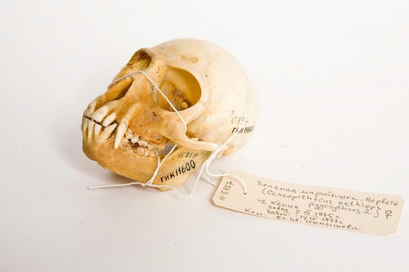 Костный материал. Череп верветы (зелёной мартышки). Cercopithecus aethiops. Классификация: Хордовые Chordata, Позвоночные Vertebrata, Млекопитающие Mammalia, Приматы Primates, Мартышковые Cercopithecidae, Cercopithecinae, Верветка Chlorocebus pygerythrus (F. Cuvier, 1821)