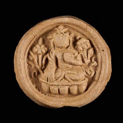 Молитвенная монета малая (?) изготовленная методом штамповки из глины. Дискообразной формы, с прибоднятыми бортиками. В центре выступающее изображение бодхисатвы, сидящего со скрещенными ногами. Левая рука бодхисатвы прижата к груди, а правая лежит на правом колене. Под подиумом бодхисатвы на ребре диска-выбоина (вероятнее всего технологический брак).