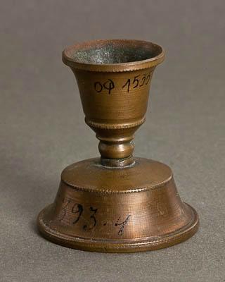 Буддийский ритуальный предмет. Медная (?) чашечка на ножке. сама чашечка в форме усечённого конуса, широкая часть которого загнута наружу. Есть бортик по краю и в месте соединения с ножкой. Чашечка приклёпана к пустотелой ножке, выполненной ввиде колокольчика. На основании ножки - бортик с примитивным орнаментом. Внутри и снаружи чашеки есть надпись тушью: инв. №3393-4 и снаружи надпись карандашом:108-3