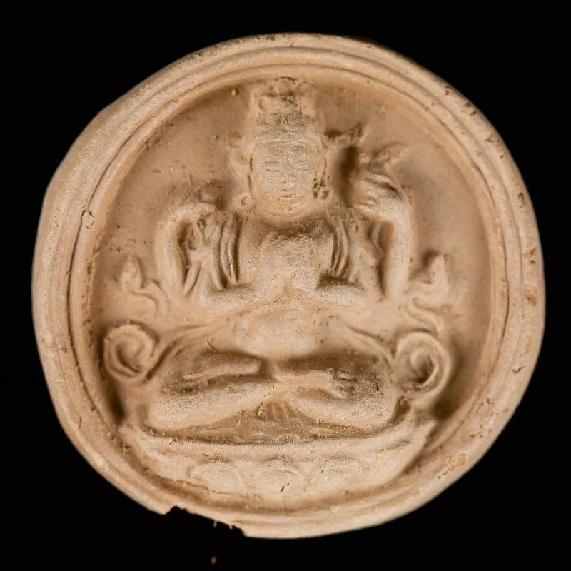 Молитвенная монета (?) изготовленная методом штамповки из глины. Дискообразной формы, с прибоднятыми бортиками. В центре выступающее изображение бодхисатвы, сидящего в позе-лотоса. Изображение крупное и объёмное. Под подиумом бодхисатвы на ребре диска-выбоина (вероятнее всего технологический брак).