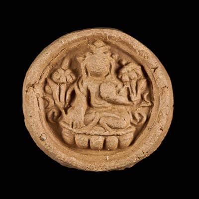 Молитвенная монета малая (?) изготовленная методом штамповки из глины. Дискообразной формы, с прибоднятыми бортиками. В центре выступающее изображение бодхисатвы, сидящего со скрещенными ногами. Левая рука бодхисатвы прижата к груди, а правая лежит на правом колене. Под подиумом бодхисатвы на ребре диска-выбоина (вероятнее всего технологический брак).