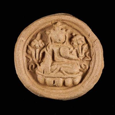 Молитвенная монета малая (?) изготовленная методом штамповки из глины. Дискообразной формы, с прибоднятыми бортиками. В центре выступающее изображение бодхисатвы, сидящего со скрещенными ногами. Левая рука бодхисатвы прижата к груди, а правая лежит на правом колене. Под подиумом бодхисатвы на ребре диска-выбоина (вероятнее всего технологический брак).