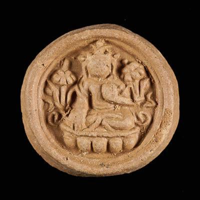 Молитвенная монета малая (?) изготовленная методом штамповки из глины. Дискообразной формы, с прибоднятыми бортиками. В центре выступающее изображение бодхисатвы, сидящего со скрещенными ногами. Левая рука бодхисатвы прижата к груди, а правая лежит на правом колене. Под подиумом бодхисатвы на ребре диска-выбоина (вероятнее всего технологический брак).
