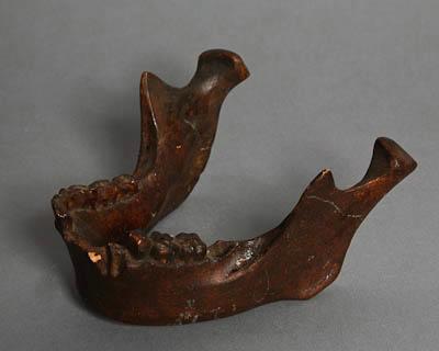 Гипсовый слепок нижней челюсти ископаемого человека. Слепок тонирован коричневой краской.