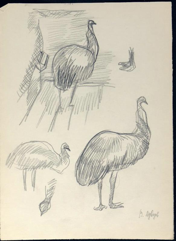 На листе вертикального формата расположены 3 наброска эму, а также 1 набросок ноги и 1 набросок головы. Наверху листа изображен эму со спины в три четверти направо. Птица находится в клетке или загоне с деревянным полом, слева к сетке прикреплена кормушка. Справа находится набросок ноги птицы. В нижней части листа - 2 наброска эму в профиль направо, первый - с втянутой шеей, второй - с вытянутой вверх. Внизу слева - набросок опущенной вниз головы.