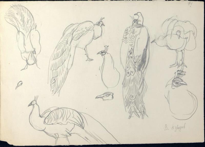 На листе горизонтального формата расположены 9 набросков павлина-самца и его головы (5 набросков - целиком, 4 наброска головы) в различных ракурсах.