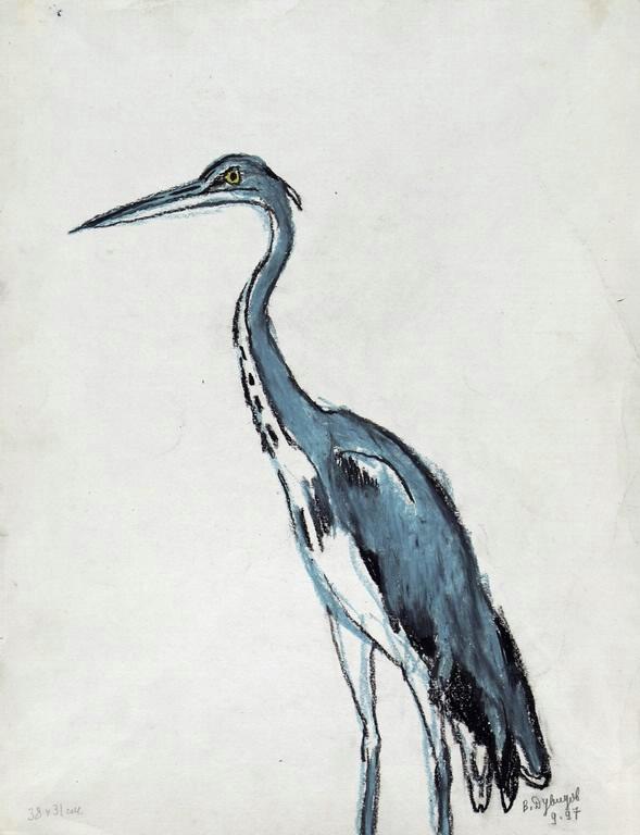 Формат вертикальный. Профильное фрагментарное изображение стоящей цапли (нижние конечности изображены не полностью - ниже коленных суставов - 1/3 от общей длины голени). Хвост опущен вниз. Поза статичная. Голова расположена слева от туловища. Птица смотрит вправо. Шея S-образно изогнута. Голова поднята вверх. Окрас туловища серовато-синий.