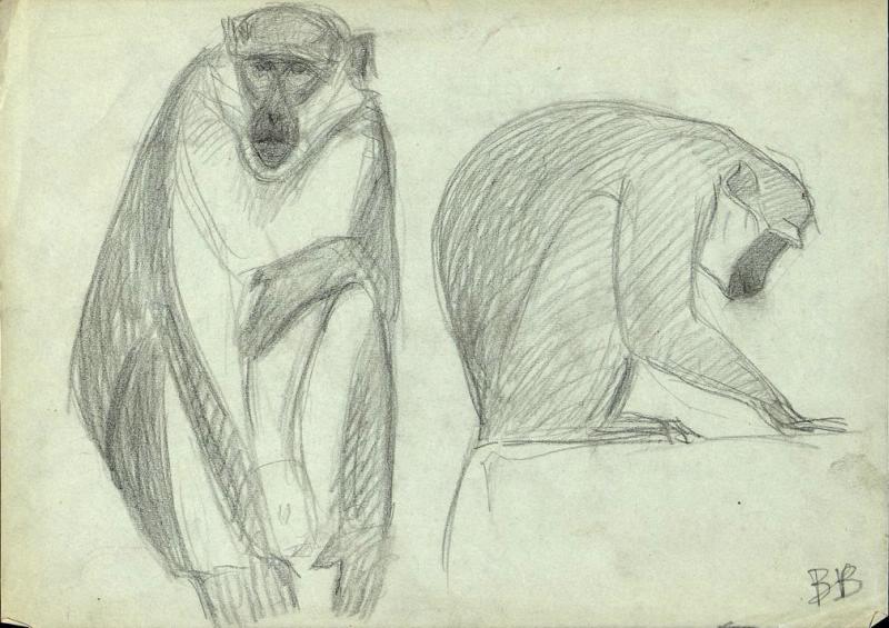 Две сидящие мартышки (в фас и в профиль). Рисунок