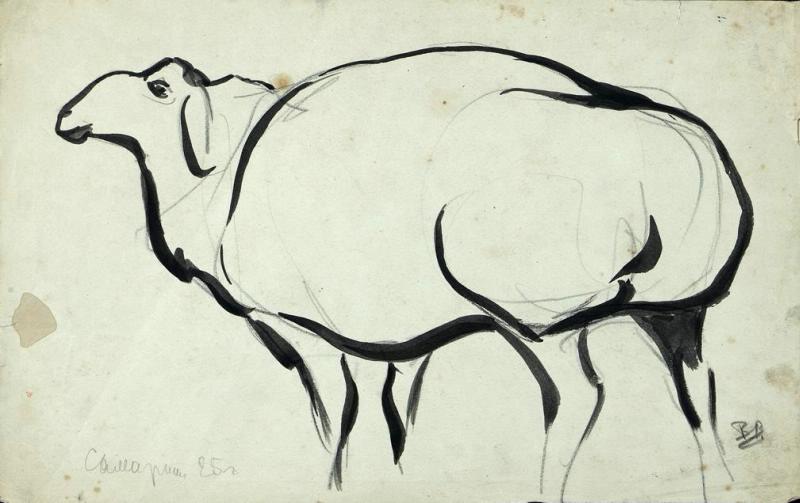 Формат горизонтальный. Овца изображена крупным планом в полупрофиль (вид сзади). Движение влево. Набросок линейный.