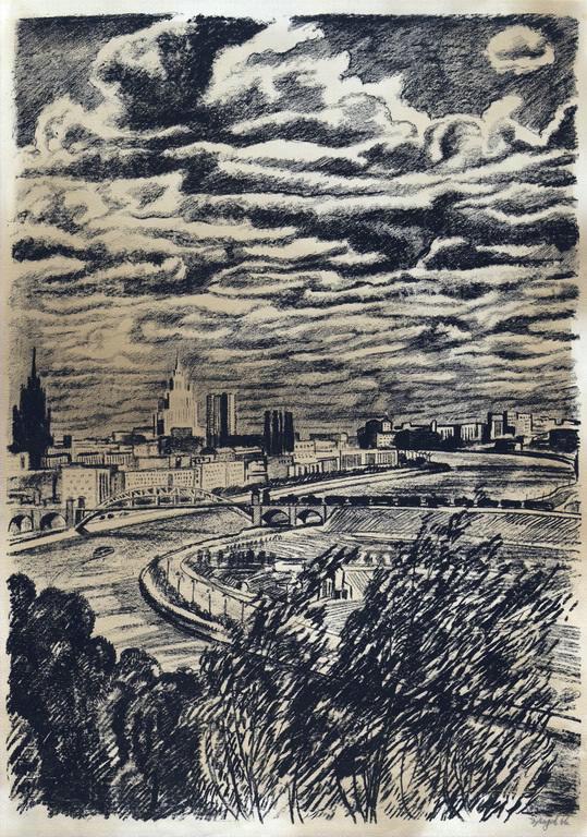 Формат вертикальный. Городской монохромный пейзаж Москвы 1960-х годов. Видна излучина реки Москва, Лужнецкий мост через реку Москва и подъезжающий к мосту товарный состав, двигающийся по старой окружной московской дороге. Вдали - силуэты сталинских высоток. На переднем плане верхушки крон деревьев. Небо с грозовыми тучами.