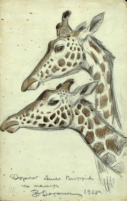 Формат вертикальный. Два профильных изображения голов жирафов (движение влево). Одно изображение под другим. Вверху - шея вытянута вертикально вверх, голова чуть опущена вниз. Внизу – шея и голова вытянуты в горизонтальном направлении. Пятна чётко прорисованы на мордах и шеях.