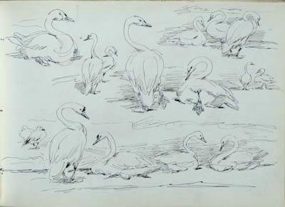 На листе 13 изображений лебедей и слева внизу набросок двух чаек. Вверху слева сидящий лебедь в профиль вправо, правее два лебедя, один из них изображен со спины. Вверху в центре крупно изображен лебедь со спины, повернувший голову вправо, рядом с ним – сидящий лебедь. Вверху справа группа из трёх лебедей, ниже маленький набросок двух лебедей. Внизу горизонтальная композиция с четырьмя лебедями, трое плывут и один стоит.