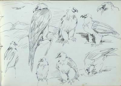 На листе 8 набросков бородачей. Слева вверху крупно со спины на фоне гористого пейзажа с летящей птицей изображен сидящий на камне бородач. Вверху справа набросок двух стоящих бородачей, один изображен фронтально с головой, повёрнутой в профиль вправо, второй показан в профиль влево. В верхнем правом углу набросок головы бородача в профиль влево. Внизу слева направо: бородач на камне в профиль вправо, бородач на камне фронтально с головой, повёрнутой влево, стоящий бородач, смотрящий влево, клюющий бородач. Альбом в зеленовато-сером картонном переплёте с коричневыми уголками и корешком из кожзаменителя, страницы сшиты верёвками, продетыми в отверстия. В каждом листе по три отверстия. Дополнительно альбом укреплён красной волнистой тесьмой. На обложке надпись, выполненная зелёной тушью через трафарет: «Естественные ф-ты 1986/87 у.г.».