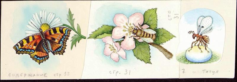 Бабочка крапивница на ромашке (с.32). Пчела на цветке шиповника (с.31). - бумага, акварель, белила. Муравей на яйце - репродукция. Три изображения: выполнены каждое самостоятельно, затем склеены между собой автором; изображение муравья приклеено на бумагу). Иллюстрация к детской книге Г.Д. Целищева "Эти удивительные насекомые"