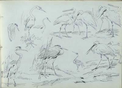 В левой части листа изображены цапли, в правой - колпицы. Вверху слева набросок стоящей цапли, слева от неё неоконченный набросок цапли со спины, справа – цапли в профиль вправо. Слева внизу набросок цапли, стоящей в воде на фоне травы, правее - цапли на берегу и идущей цапли в профиль влево. Вверху справа набросок пяти стоящих колпиц и головы колпицы. Внизу справа изображены три идущие колпицы, фигура последней срезана краем листа.