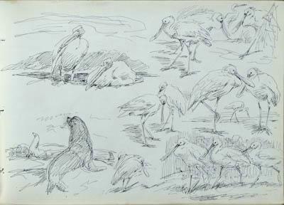Колпицы, пеликаны и морской котик. Лист из альбома