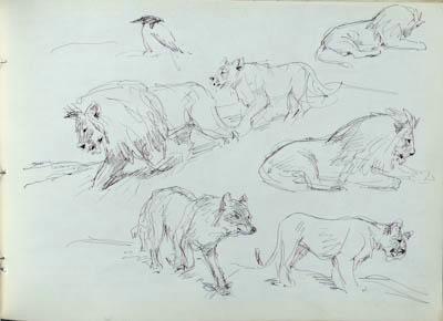 Слева вверху изображена ворона в профиль влево. Слева внизу набросок идущего волка. В центре листа идущие справа налево лев и львица. В правой части листа три наброска льва, два лежащих и один стоящий.