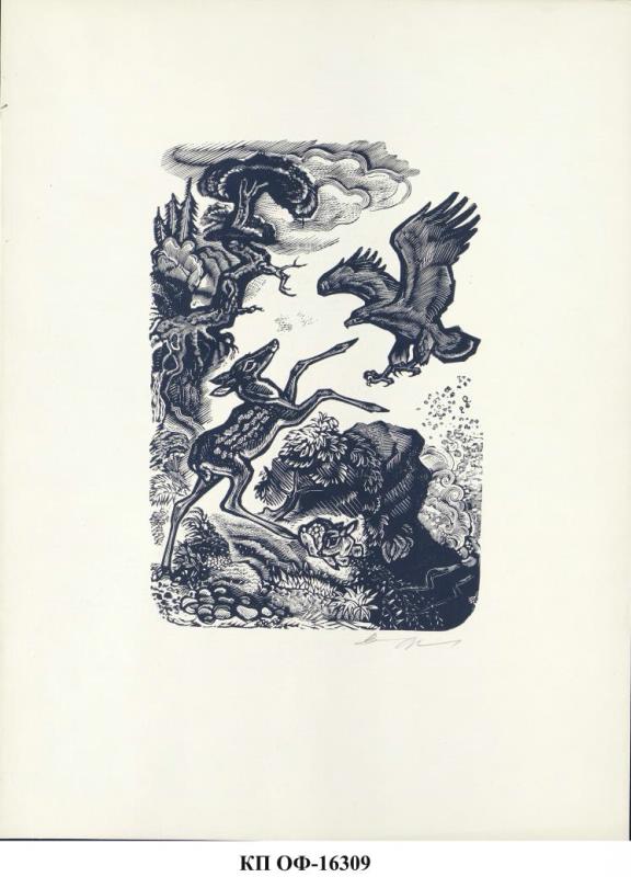 Формат вертикальный. Справа изображён подлетающий орёл, выпустивший когти и готовящийся напасть на лежащего в небольшом укрытии оленёнка. Крылья орла приподняты вверх. Оленуха, отчаянно защищающая своего детёныша от нападения, и оленёнок, лежащий в укрытии, представлены слева. Оленуха изображена в профиль, стоя на двух задних конечностях, передними она отбивает атаку налетевшего хищника. Сцена вписана в горный пейзаж. Слева на самой вершине горы изображено мощное дерево, крона которого упирается в облака. Пейзаж весьма условный, изображения животных несколько стилизованы. Облака тёмно-серые, грозовые, что усиливает впечатление угрозы, нависшей над оленями, и неминуемой победы хищника, "железные" когти которого вонзятся вот-вот в спину маленького существа, которое станет по жестоким законам природы жертвой и возможной пищей не только самому орлу, но и орлятам, ожидающим её в гнездовье, устроенном на скале. Так вглядит законмерная сцена бытия, имнуемая -:отношение хищника и жертвы, инстинкт заботы о потомстве .