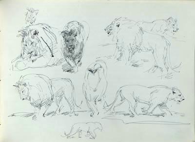 В верхнем левом углу набросок головы льва в фас, ниже набросок лежащего льва в фас и идущего льва в фас. Слева внизу набросок стоящего льва с опущенной головой в профиль влево, правее неоконченный набросок стоящего льва в фас, ниже маленький контурный набросок льва в профиль вправо. В верхнем правом углу изображен стоящий лев в профиль влево, за ним стоит львица в профиль вправо. В нижнем правом углу набросок идущей львицы в профиль вправо.